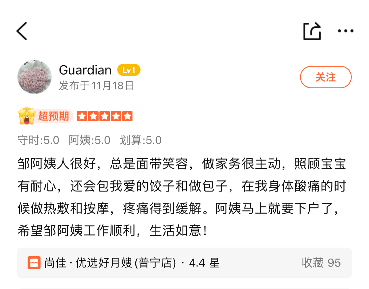 英姐雖然是江西瑞金人,家在潮汕都十出年了,等于半個(gè)汕頭人,英姐性格好,護(hù)理專業(yè)科學(xué),細(xì)心到位,和客戶相處融洽,月子餐美味,對寶寶護(hù)理很用心,細(xì)心;日常護(hù)理做得很到位,及時(shí)發(fā)現(xiàn)寶寶的身體癥狀并告知寶媽。英姐做的月子餐也很好吃,每天的菜色不帶重復(fù)的,也能及時(shí)調(diào)整寶媽的口味,非常棒!為人也很開朗,勤快,客戶的家人都贊不絕口! 極力推薦!
