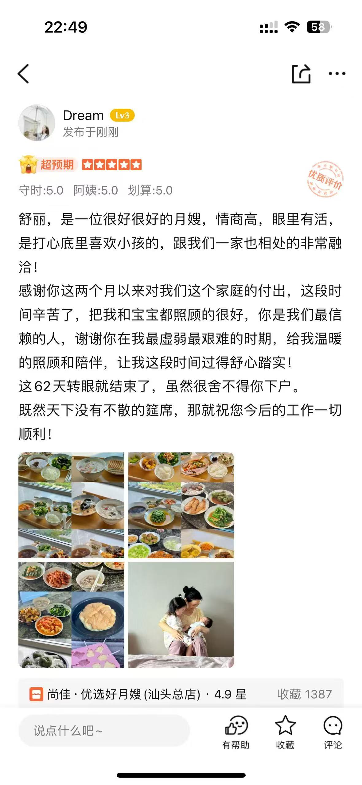 舒麗姐來自湖南,性格溫柔,做事利索隨和、大方、有愛心、負責任、愛崗敬業(yè)的好月嫂。她掌握了多項專業(yè)技能,加入尚佳月嫂也有一定年限了,擁有豐富的育嬰心得。月子餐方面擅長潮汕菜。面食也做的很棒,在寶媽方面比較擅長:傷口護理、產后恢復操指導和健康飲食控制等;在寶寶方面比較擅長:預防鵝口瘡、尿布疹、黃疸護理、撫觸操和排氣操等。 和寶媽一家人相處和諧,做事不計較,值得推薦!