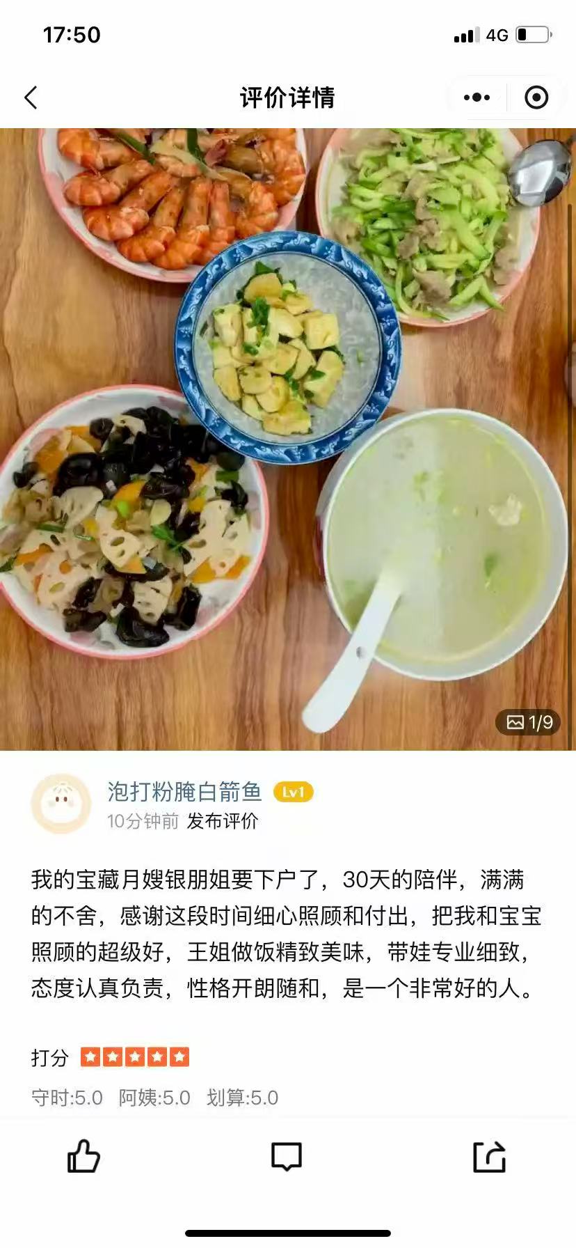 王姐來自湖北省黃岡市蘄春縣,性格溫和,善于傾聽,理解她人,有愛心、耐心、做事認(rèn)真,仔細(xì)。愛學(xué)習(xí)的她前后獲得了高級營養(yǎng)師證、產(chǎn)后康復(fù)證、母嬰護(hù)理證、催乳證。是綜合素質(zhì)較全面的月嫂。月子期會根據(jù)寶媽身體做美味清淡的月子餐,有月子中心服務(wù)經(jīng)驗(yàn),帶過雙胎和早產(chǎn)寶寶。服務(wù)過的寶媽對她的評價都很高。寶寶護(hù)理方面會黃疸觀察,紅臀、濕疹的預(yù)防及護(hù)理,臍部護(hù)理,二便觀察,撫觸及護(hù)理手法溫柔舒適,也擅長給寶寶早早教;寶媽護(hù)理方面會傷口護(hù)理,惡露觀察,乳房護(hù)理,會協(xié)助寶媽母乳喂養(yǎng),把王姐姐帶回家,寶媽一定會有個愉快的