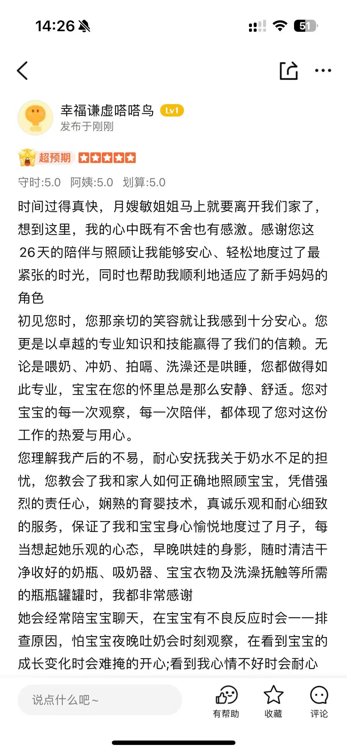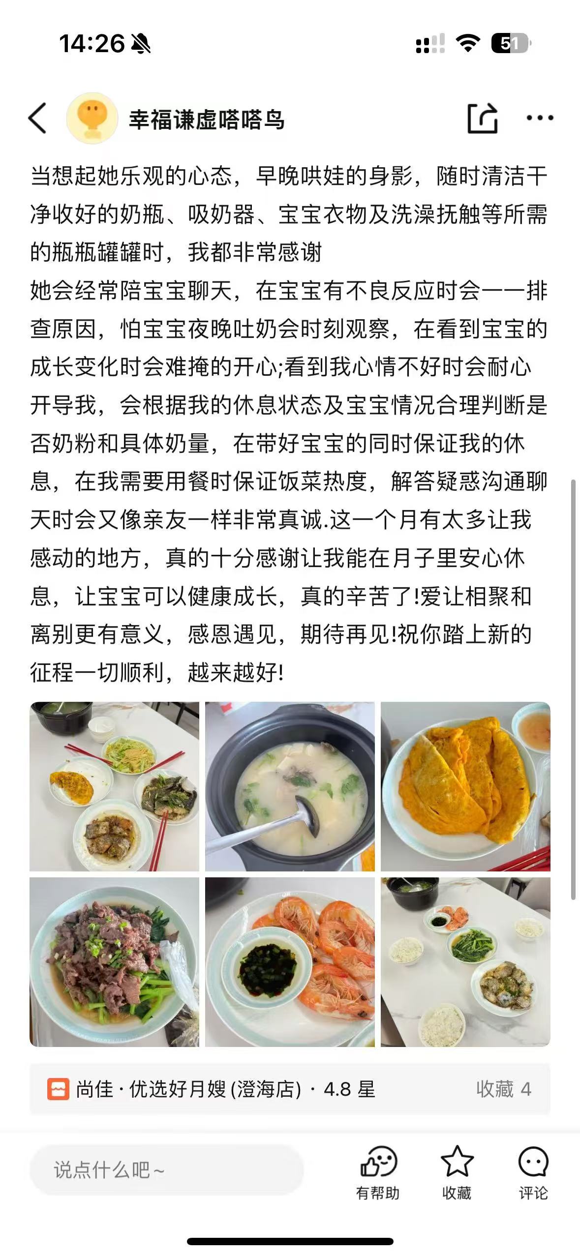 敏姐姐來自河南新野縣,樂觀積極、有耐心脾氣好,照顧寶寶細致耐心,做事麻利、勤快愛干凈。之前從事過美容養(yǎng)生,從事母嬰行業(yè)多年,有著豐富的護理經(jīng)驗。帶過早產(chǎn)兒、低體重兒等特殊寶寶,服務過雙胞胎寶寶。服務過妊娠糖尿病、高血壓寶媽。敏姐姐的廚藝也非常的好。被敏姐姐照顧的寶媽對她做的月子餐都贊不絕口。她還會根據(jù)寶媽的身體體質(zhì)去搭配營養(yǎng)的月子餐,在月子里敏姐姐還會用她之前學習到的一些美容養(yǎng)生手法給寶媽進行身體按摩。讓寶媽度過一個舒心舒適的月子。